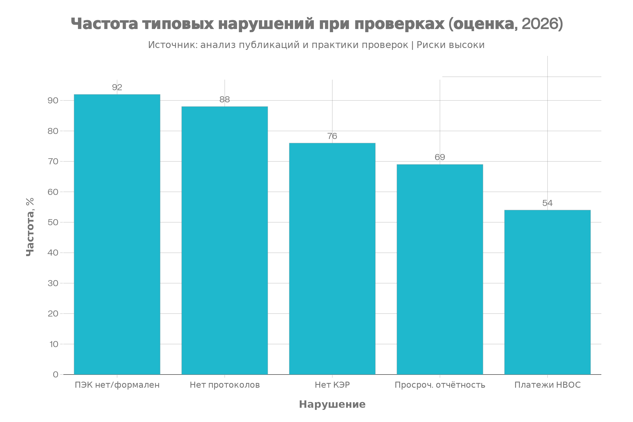 По материалам профильных публикаций и практики проверок, наиболее частые претензии связаны не с «экологией в целом», а с конкретными несоответствиями между документами и фактом. Особенно часто это касается ПЭК, протоколов аккредитованной лаборатории, отчётности и подтверждения того, что предприятие действительно контролирует источники воздействия.